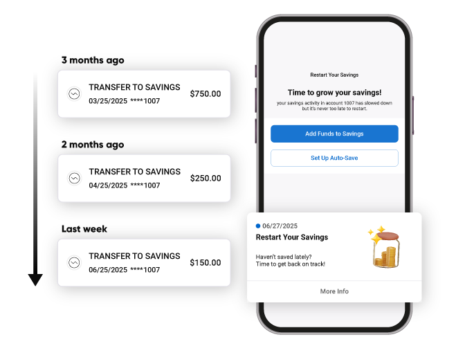 Spot early churn signals, such as decreased saving or card usage, and re-engage dormant customers with tailored offers that can be configured to your business needs.